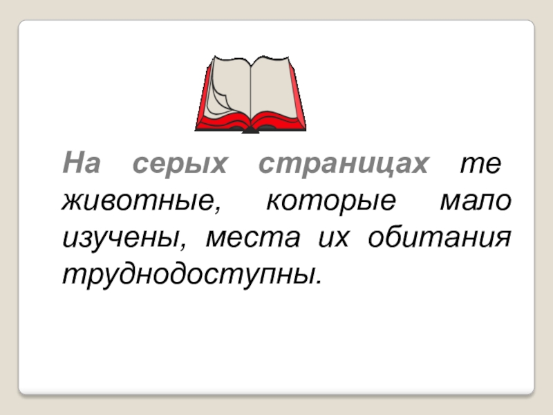 Слайд 24На серых страницах те животные, которые мало изучены, места их обитания