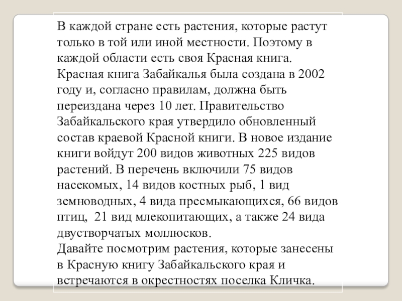 Красная книга Забайкалья была создана в 2002 году и, согласно правилам, должна быть переиздана через 10 лет. Правительство Забайкальского края утвердило обновленный состав краевой Красной книги. В новое издание книги войдут 200 видов животных 225 видов растений. В перечень включили 75 видов насекомых, 14 видов костных рыб, 1 вид земноводных, 4 вида пресмыкающихся, 66 видов птиц, 21 вид млекопитающих, а также 24 вида двустворчатых моллюсков.