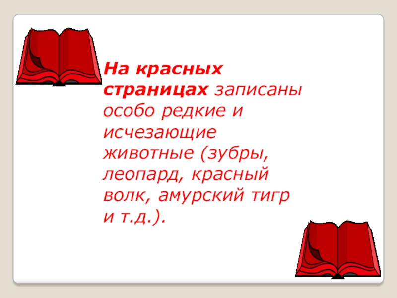 Слайд 11На красных страницах записаны особо редкие и исчезающие животные (зубры, леопард,
