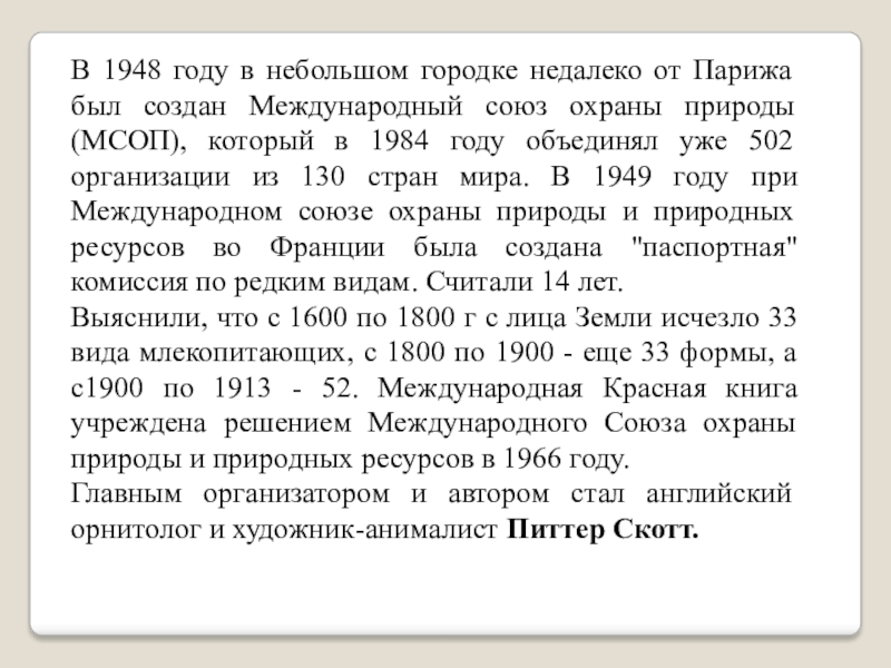 Выяснили, что с 1600 по 1800 г с лица Земли исчезло 33 вида млекопитающих, с 1800 по 1900 - еще 33 формы, а с1900 по 1913 - 52. Международная Красная книга учреждена решением Международного Союза охраны природы и природных ресурсов в 1966 году.