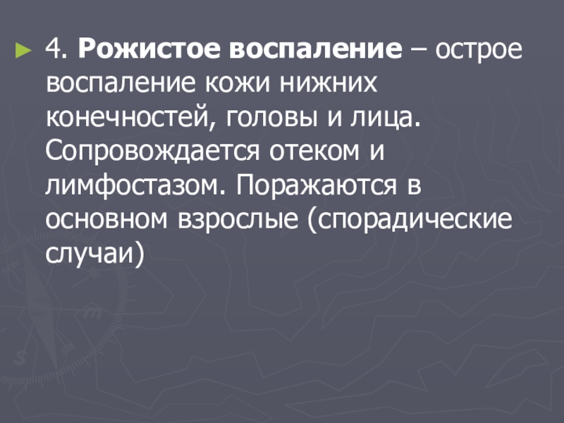 4. Рожистое воспаление – острое воспаление кожи нижних конечностей, головы и лица. Сопровождается отеком и лимфостазом. Поражаются