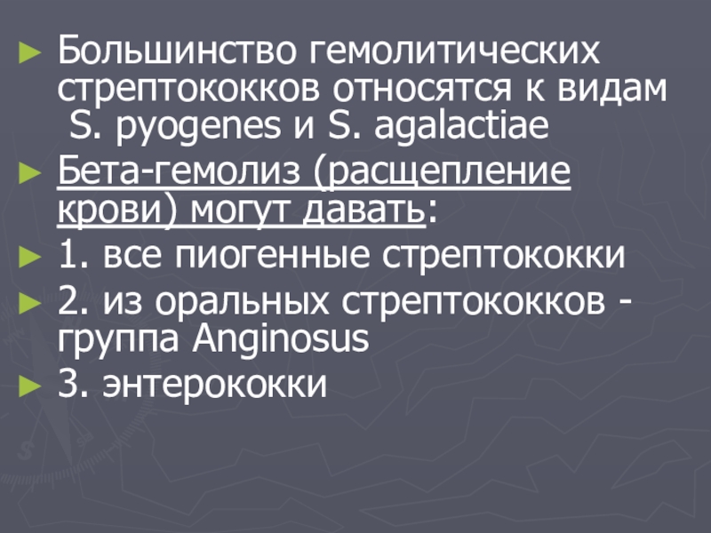 Большинство гемолитических стрептококков относятся к видам  S. pyogenes и S. аgalactiaeБета-гемолиз (расщепление крови) могут давать:1. все