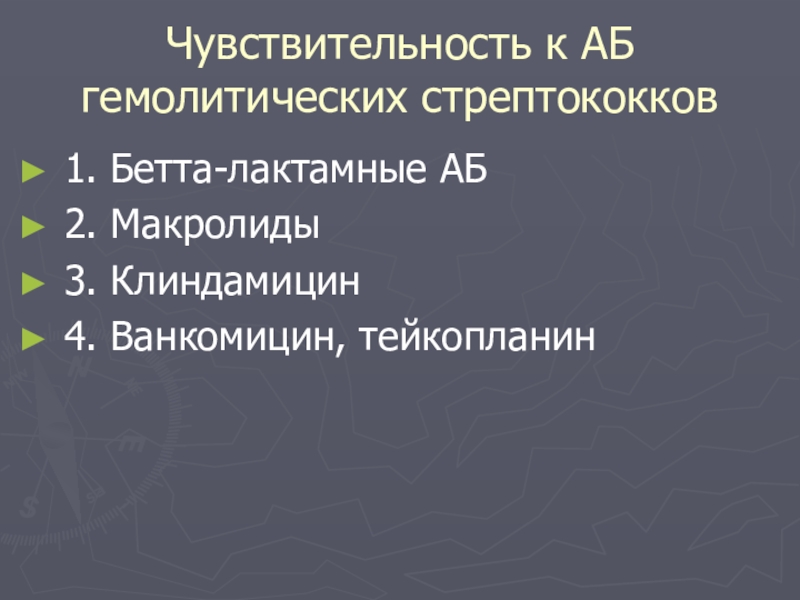 Чувствительность к АБ гемолитических стрептококков1. Бетта-лактамные АБ 2. Макролиды 3. Клиндамицин4. Ванкомицин, тейкопланин