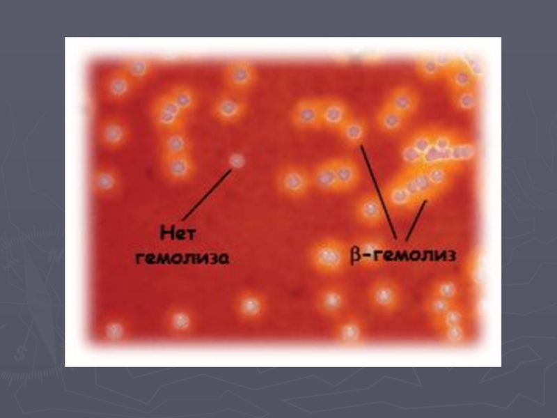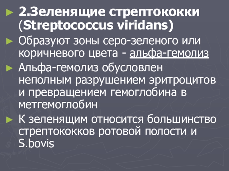 2.Зеленящие стрептококки (Streptococcus viridans)Образуют зоны серо-зеленого или коричневого цвета - альфа-гемолизАльфа-гемолиз обусловлен неполным разрушением эритроцитов и превращением