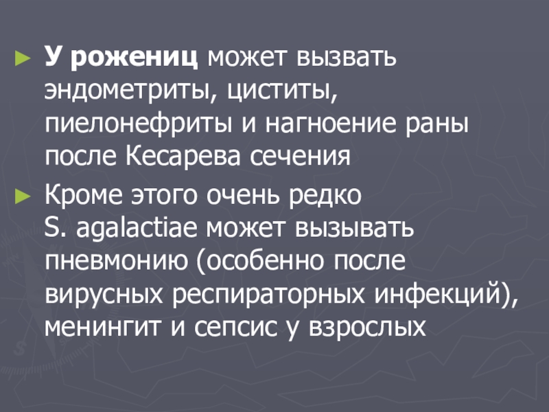 Кроме этого очень редко S. agalactiae может вызывать пневмонию (особенно после вирусных респираторных инфекций), менингит и сепсис у взрослых