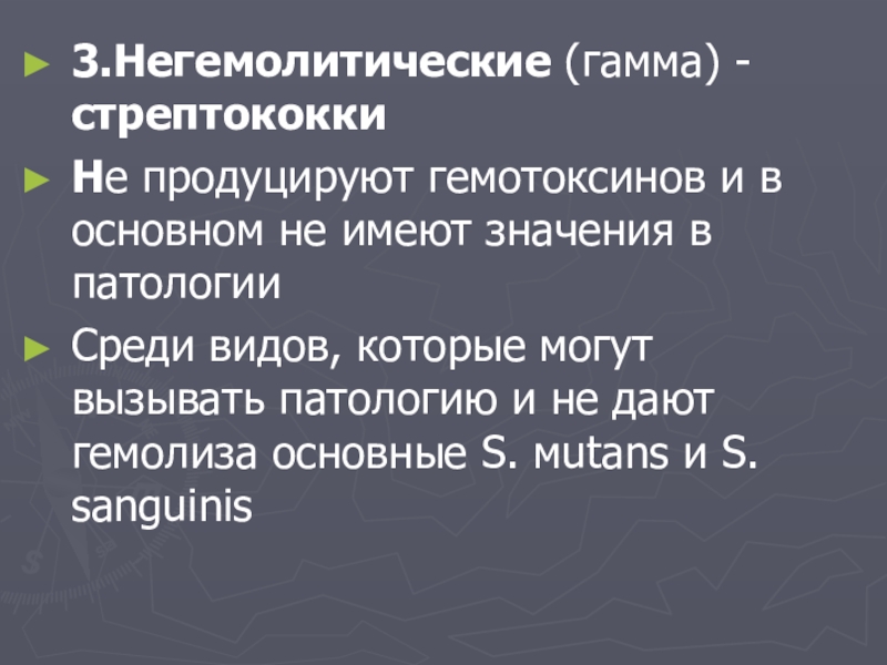 3.Негемолитические (гамма) - стрептококки Не продуцируют гемотоксинов и в основном не имеют значения в патологииСреди видов, которые