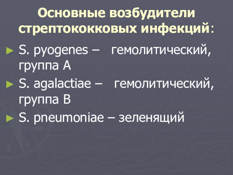 Основные возбудители стрептококковых инфекций:S. pyogenes –  гемолитический, группа АS. agalactiae –  гемолитический, группа ВS. pneumoniae