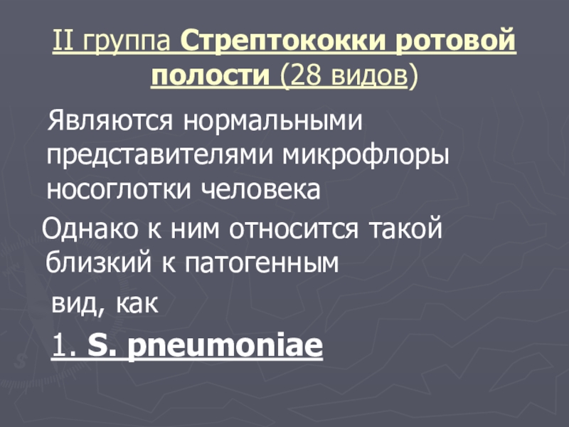II группа Стрептококки ротовой полости (28 видов)  Являются нормальными представителями микрофлоры носоглотки человека Однако к ним
