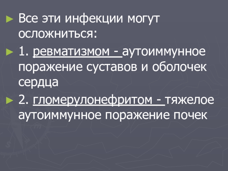 Все эти инфекции могут осложниться: 1. ревматизмом - аутоиммунное поражение суставов и оболочек сердца 2. гломерулонефритом -
