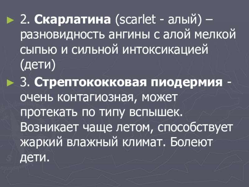 2. Скарлатина (scarlet - алый) – разновидность ангины с алой мелкой сыпью и сильной интоксикацией (дети)3. Стрептококковая