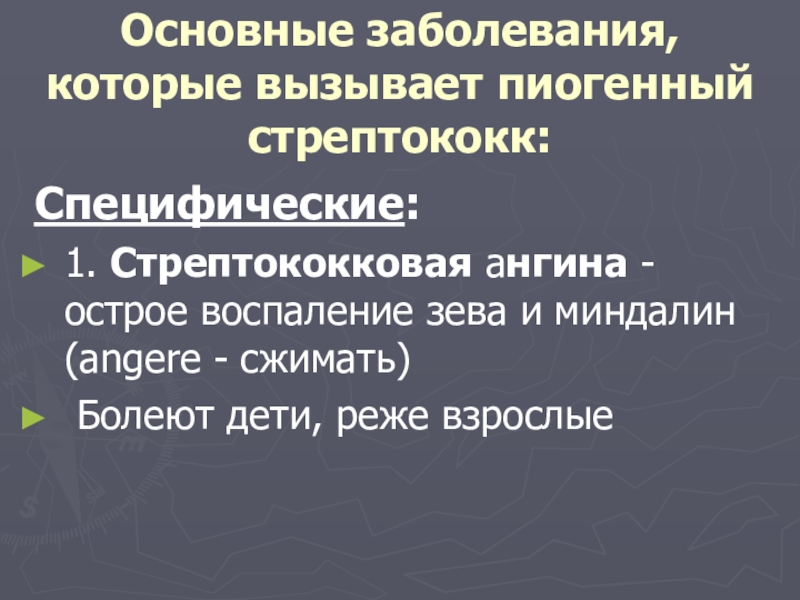 Основные заболевания, которые вызывает пиогенный стрептококк:Специфические:1. Стрептококковая ангина - острое воспаление зева и миндалин  (angere -