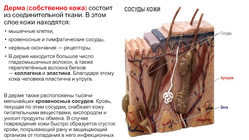 В дерме также расположены тысячи мельчайших кровеносных сосудов. Кровь, текущая по этим сосудам, снабжает кожу питательными веществами, кислородом и уносит продукты обмена. В случае повреждения кожи быстро образуется сгусток крови, покрывающий рану и защищающий организм от попадания в него инфекционных агентов.