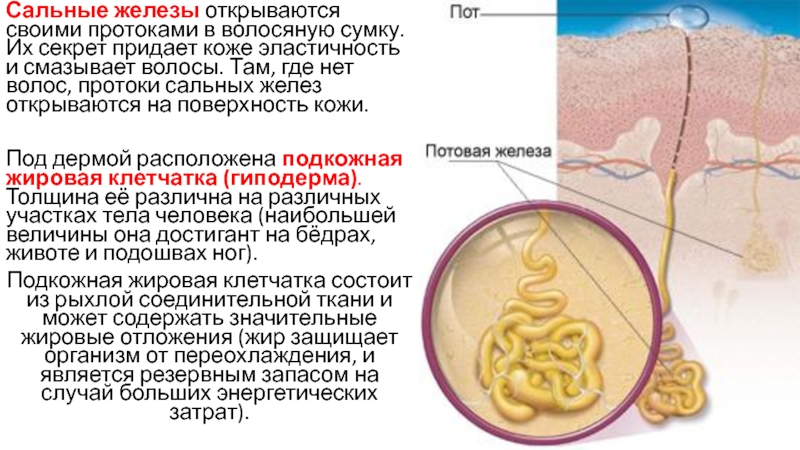 эластичность и смазывает волосы. Там, где нет волос, протоки сальных желез открываются на поверхность кожи.