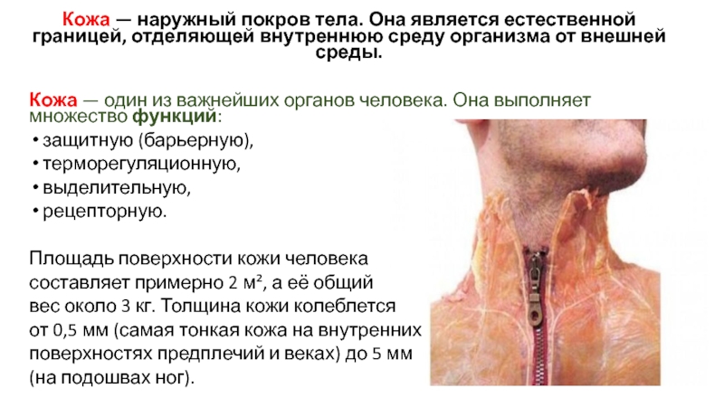 Слайд 2Кожа — наружный покров тела. Она является естественной границей, отделяющей внутреннюю среду организма от внешней