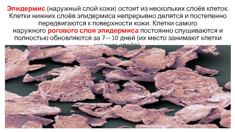 эпидермиса непрерывно делятся и постепенно передвигаются к поверхности кожи. Клетки самого наружного рогового слоя эпидермиса постоянно слущиваются и полностью обновляются за 7—10 дней (их место занимают клетки нижних слоёв).