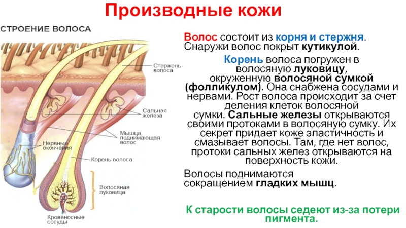 окруженную волосяной сумкой (фолликулом). Она снабжена сосудами и нервами. Рост волоса происходит за счет деления клеток волосяной сумки. Сальные железы открываются своими протоками в волосяную сумку. Их секрет придает коже эластичность и смазывает волосы. Там, где нет волос, протоки сальных желез открываются на поверхность кожи.