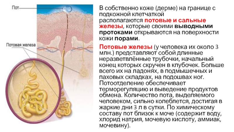 Потовые железы (у человека их около 3 млн.) представляют собой длинные неразветвлённые трубочки, начальный конец которых скручен в клубочек. Больше всего их на ладонях, в подмышечных и паховых складках, на подошвах ног. Потоотделение обеспечивает терморегуляцию и выведение продуктов обмена. Количество пота, выделяемого человеком, сильно колеблется, достигая в жаркие дни 3 л в сутки. По химическому составу пот близок к моче (содержит воду, хлорид натрия, мочевую кислоту, аммиак, мочевину).
