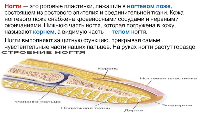 Слайд 11Ногти — это роговые пластинки, лежащие в ногтевом ложе, состоящем из ростового эпителия