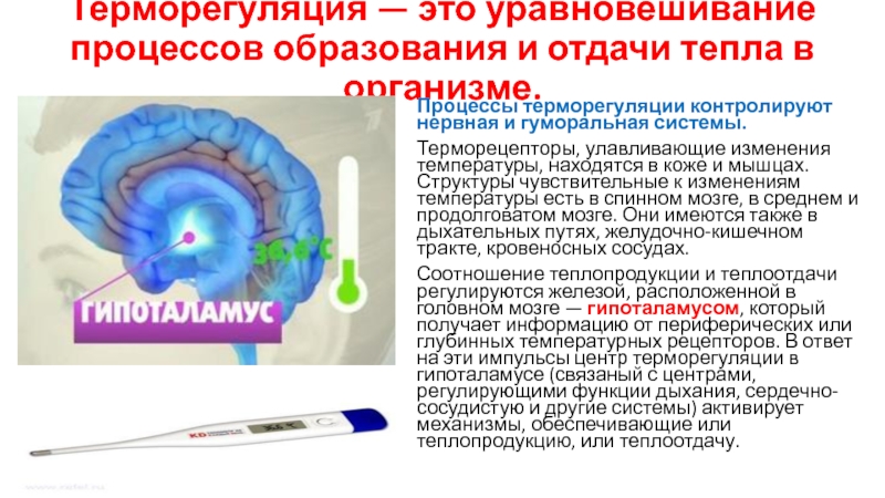 Слайд 13Терморегуляция — это уравновешивание процессов образования и отдачи тепла в организме.