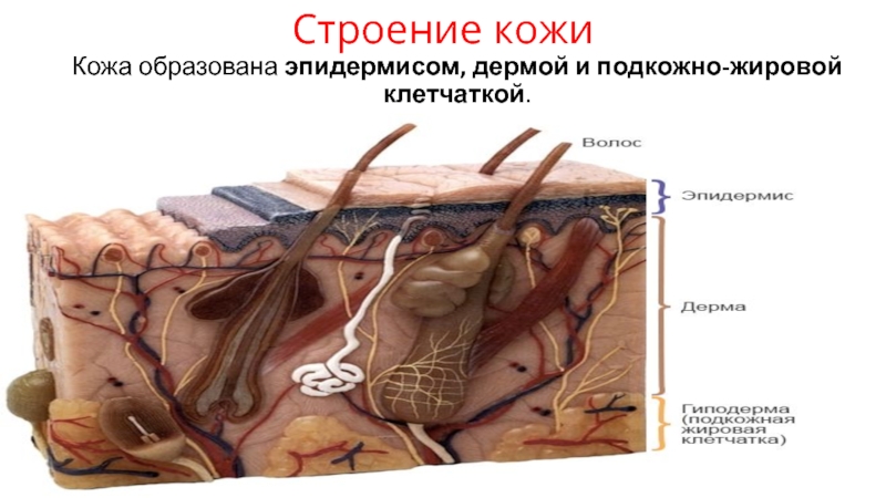 Кожа образована эпидермисом, дермой и подкожно-жировой клетчаткой.