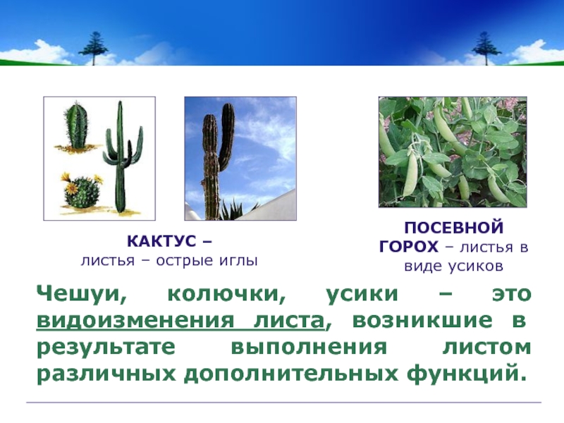 Чешуи, колючки, усики – это видоизменения листа, возникшие в результате выполнения листом различных дополнительных функций.