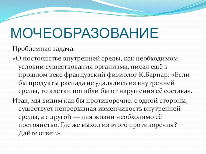 ещё в прошлом веке французский физиолог К.Барнар: «Если бы продукты распада не удалялись из внутренней среды, то клетки погибли бы от нарушения её состава».