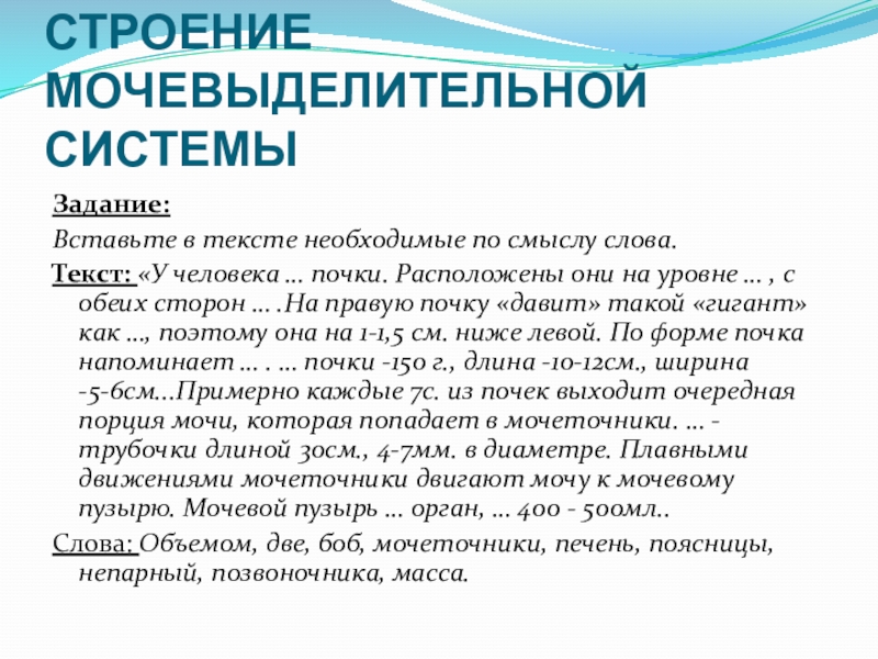 Слова: Объемом, две, боб, мочеточники, печень, поясницы, непарный, позвоночника, масса.