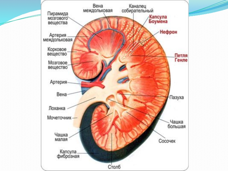-Корковый слой, мозговой слой, лоханка - строение почки