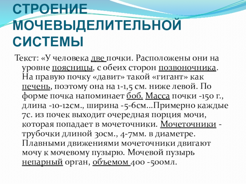 поясницы, с обеих сторон позвоночника. На правую почку «давит» такой «гигант» как печень, поэтому она на 1-1,5 см. ниже левой. По форме почка напоминает боб. Масса почки -150 г., длина -10-12см., ширина -5-6см...Примерно каждые 7с. из почек выходит очередная порция мочи, которая попадает в мочеточники. Мочеточники - трубочки длиной 30см., 4-7мм. в диаметре. Плавными движениями мочеточники двигают мочу к мочевому пузырю. Мочевой пузырь непарный орган, объемом 400 -500мл.