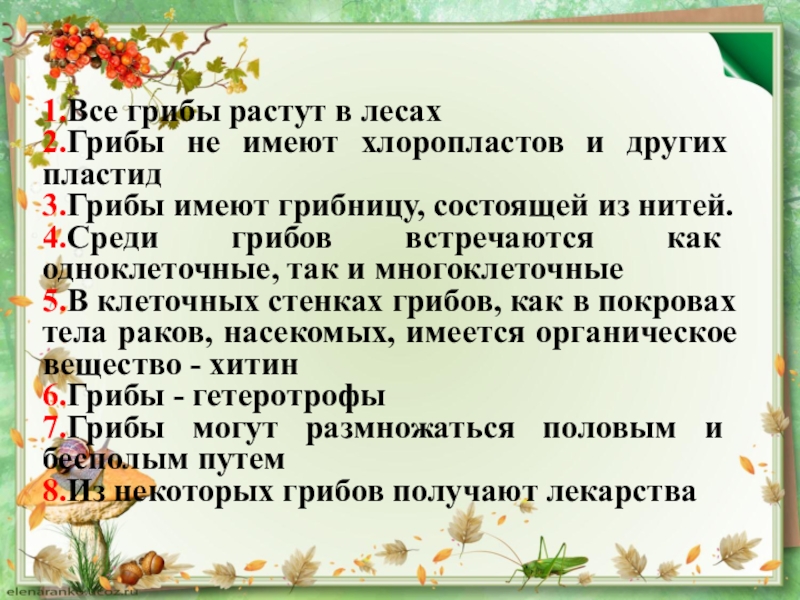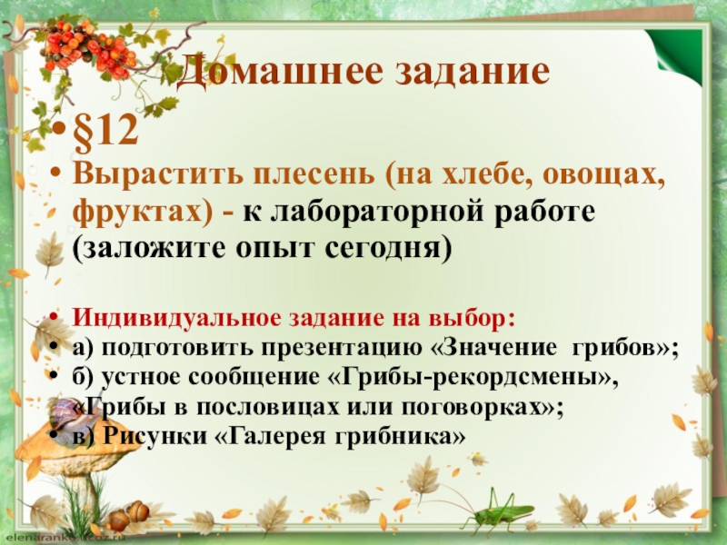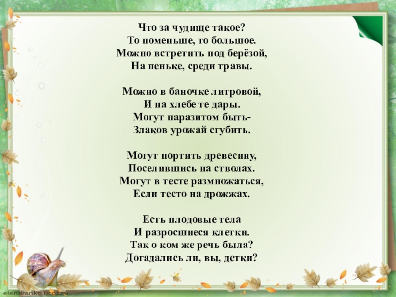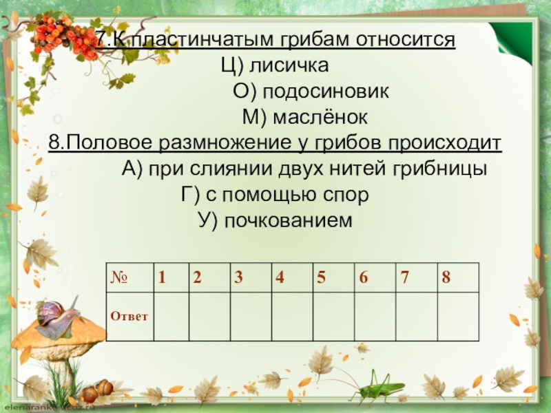 б) устное сообщение «Грибы-рекордсмены», «Грибы в пословицах или поговорках»;