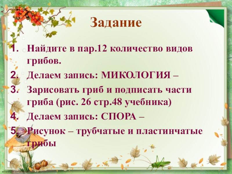 гриб и подписать части гриба (рис. 26 стр.48 учебника)