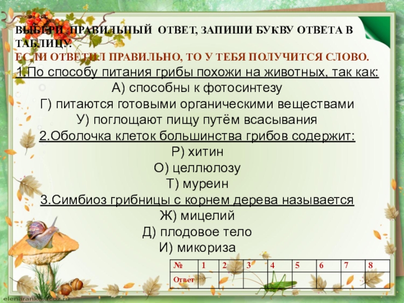 Слайд 13ВЫБЕРИ ПРАВИЛЬНЫЙ ОТВЕТ, ЗАПИШИ БУКВУ ОТВЕТА В ТАБЛИЦУ.