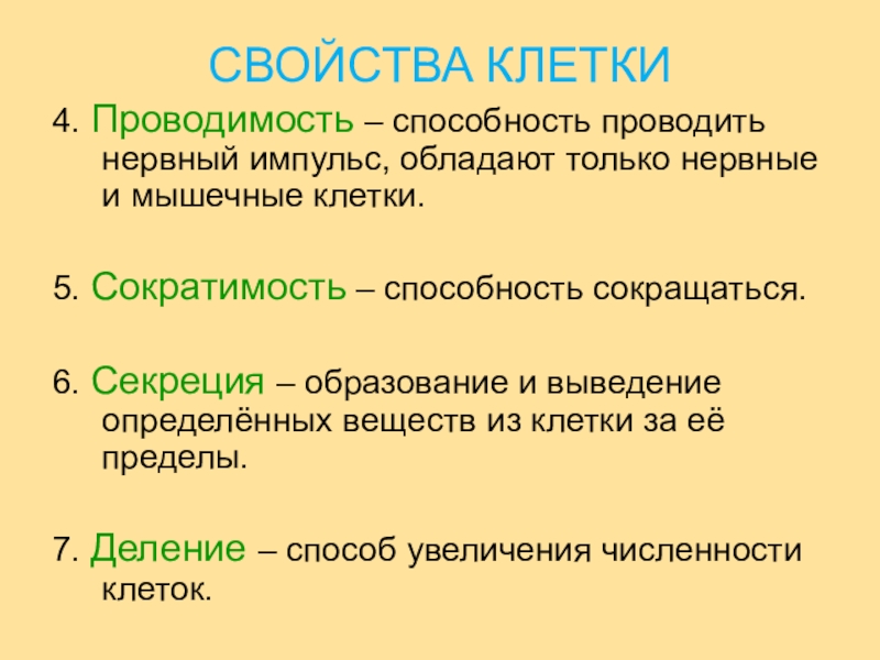 СВОЙСТВА КЛЕТКИ4. Проводимость – способность проводить нервный импульс, обладают только нервные и мышечные клетки.5. Сократимость – способность