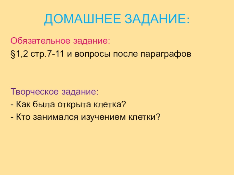 ДОМАШНЕЕ ЗАДАНИЕ:Обязательное задание:§1,2 стр.7-11 и вопросы после параграфовТворческое задание:- Как была открыта клетка?- Кто занимался изучением клетки?