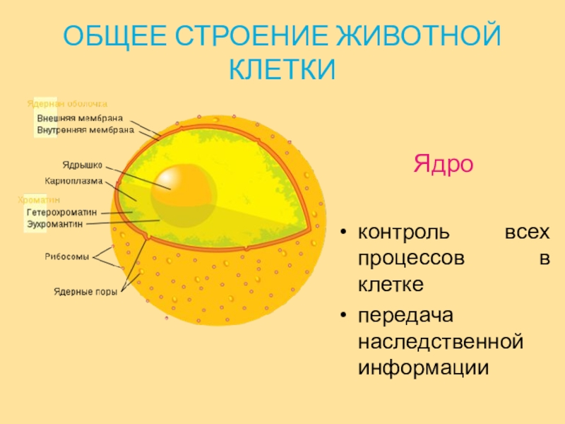ОБЩЕЕ СТРОЕНИЕ ЖИВОТНОЙ КЛЕТКИЯдроконтроль всех процессов в клеткепередача наследственной информации
