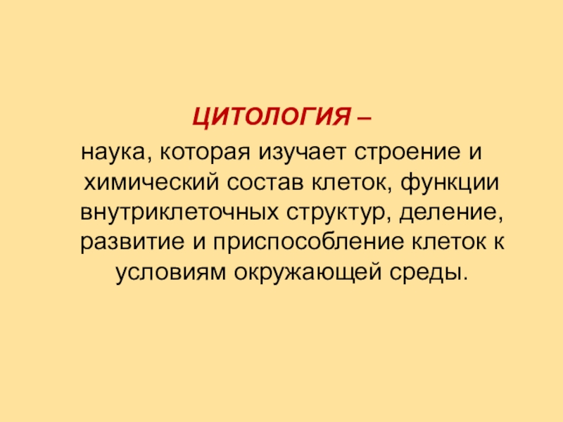 ЦИТОЛОГИЯ – наука, которая изучает строение и химический состав клеток, функции внутриклеточных структур, деление, развитие и приспособление