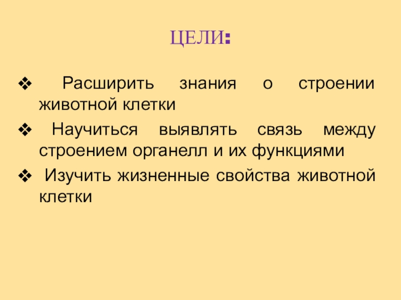 ЦЕЛИ: Расширить знания о строении животной клетки Научиться выявлять связь между строением органелл и их функциями Изучить