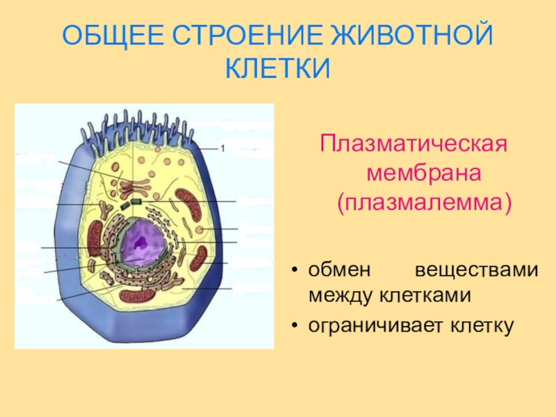 ОБЩЕЕ СТРОЕНИЕ ЖИВОТНОЙ КЛЕТКИПлазматическая мембрана (плазмалемма)обмен веществами между клеткамиограничивает клетку
