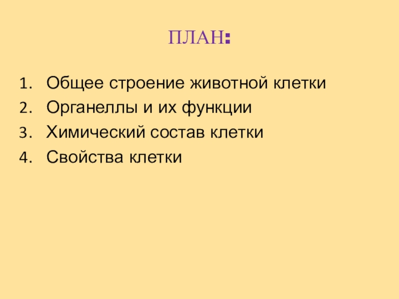 ПЛАН:Общее строение животной клеткиОрганеллы и их функцииХимический состав клеткиСвойства клетки