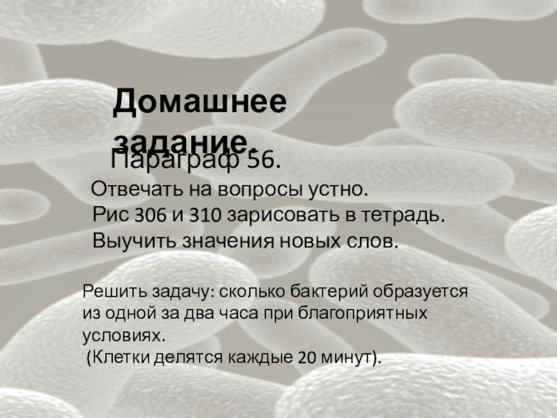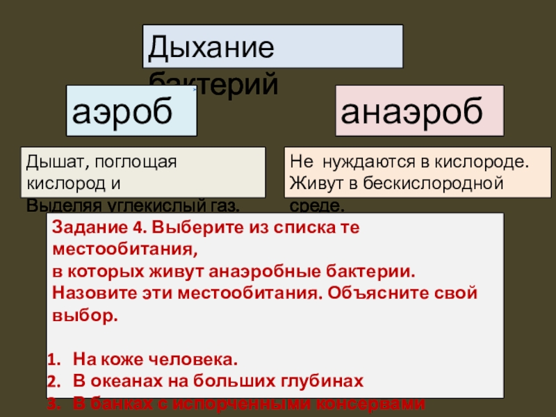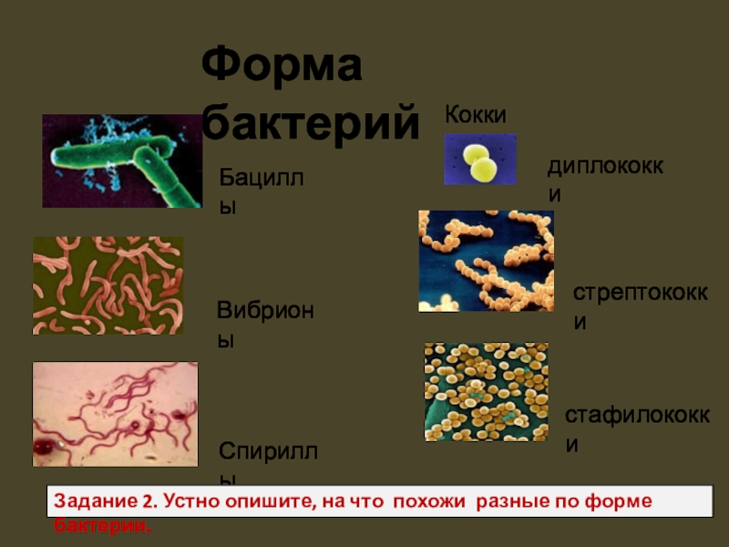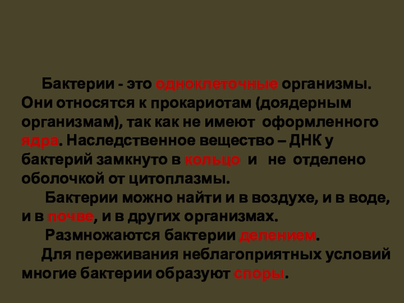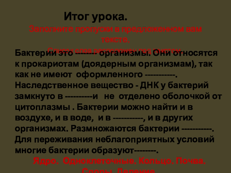 Бактерии это -------- организмы. Они относятся к прокариотам (доядерным организмам), так как не имеют оформленного -----------. Наследственное вещество - ДНК у бактерий замкнуто в ----------и не отделено оболочкой от цитоплазмы . Бактерии можно найти и в воздухе, и в воде, и в -----------, и в других организмах. Размножаются бактерии -----------. Для переживания неблагоприятных условий многие бактерии образуют--------.