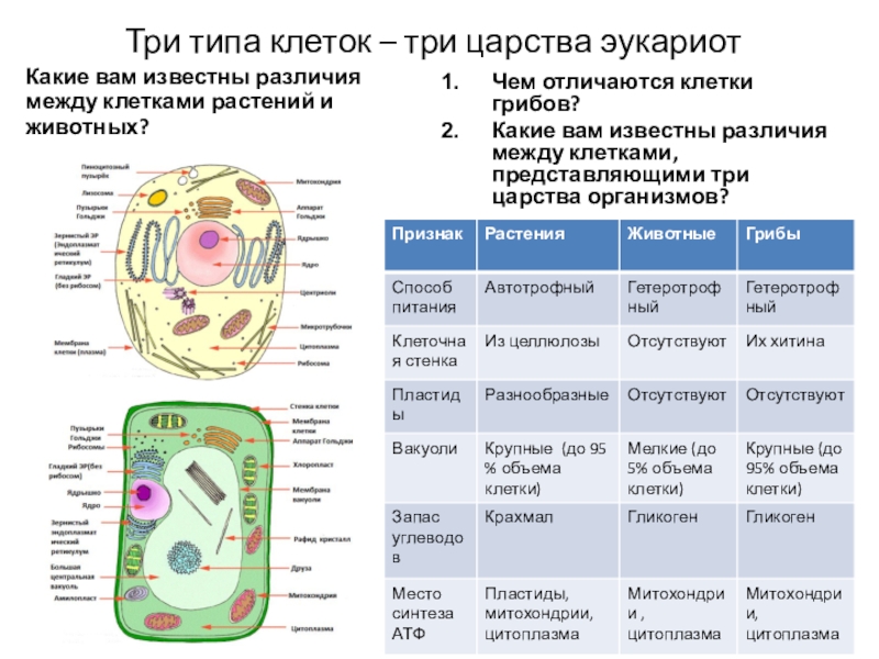 Какие вам известны различия между клетками, представляющими три царства организмов?
