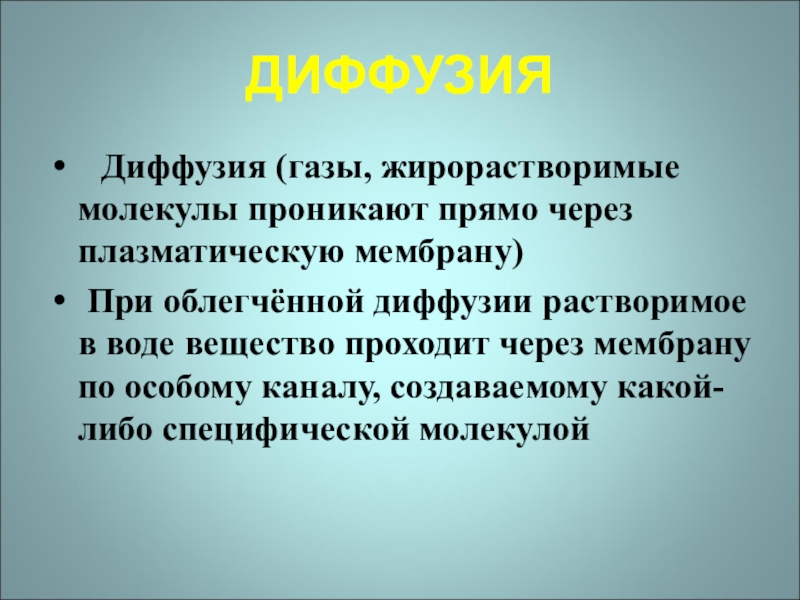При облегчённой диффузии растворимое в воде вещество проходит через мембрану по особому каналу, создаваемому какой-либо специфической молекулой