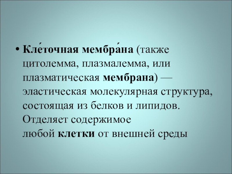 Кле́точная мембра́на (также цитолемма, плазмалемма, или плазматическая мембрана) — эластическая молекулярная структура, состоящая из
