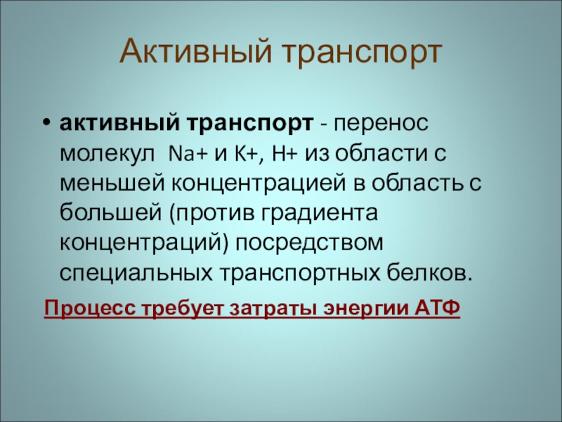 активный транспорт - перенос молекул Na+ и K+, H+ из области