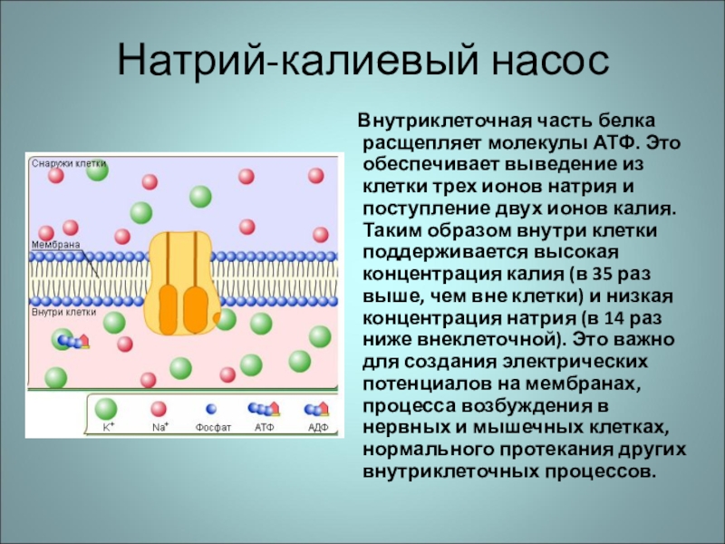 Это обеспечивает выведение из клетки трех ионов натрия и поступление двух ионов калия. Таким образом внутри клетки поддерживается высокая концентрация калия (в 35 раз выше, чем вне клетки) и низкая концентрация натрия (в 14 раз ниже внеклеточной). Это важно для создания электрических потенциалов на мембранах, процесса возбуждения в нервных и мышечных клетках, нормального протекания других внутриклеточных процессов.