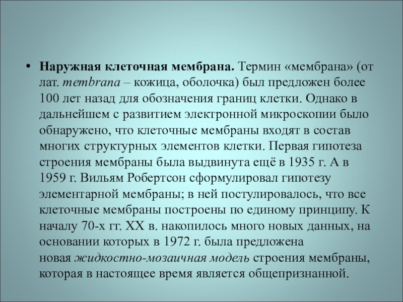 100 лет назад для обозначения границ клетки. Однако в дальнейшем с развитием электронной микроскопии было обнаружено, что клеточные мембраны входят в состав многих структурных элементов клетки. Первая гипотеза строения мембраны была выдвинута ещё в 1935 г. А в 1959 г. Вильям Робертсон сформулировал гипотезу элементарной мембраны; в ней постулировалось, что все клеточные мембраны построены по единому принципу. К началу 70-х гг. XX в. накопилось много новых данных, на основании которых в 1972 г. была предложена новая жидкостно-мозаичная модель строения мембраны, которая в настоящее время является общепризнанной.