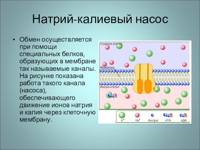 так называемые каналы. На рисунке показана работа такого канала (насоса), обеспечивающего движение ионов натрия и калия через клеточную мембрану.