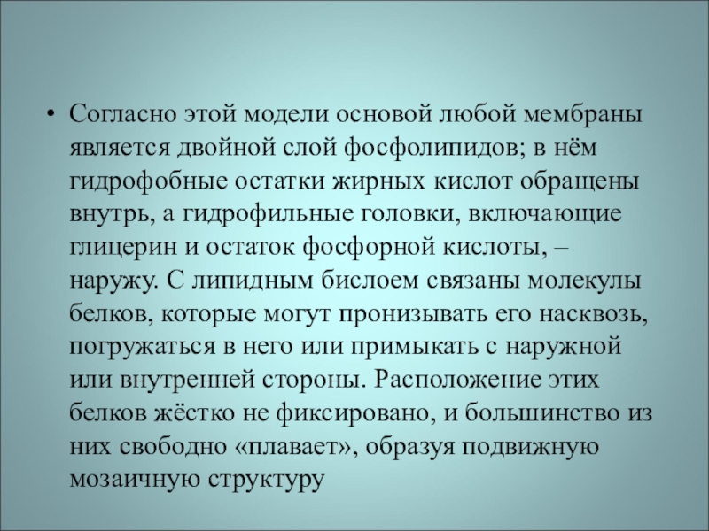 гидрофобные остатки жирных кислот обращены внутрь, а гидрофильные головки, включающие глицерин и остаток фосфорной кислоты, – наружу. С липидным бислоем связаны молекулы белков, которые могут пронизывать его насквозь, погружаться в него или примыкать с наружной или внутренней стороны. Расположение этих белков жёстко не фиксировано, и большинство из них свободно «плавает», образуя подвижную мозаичную структуру