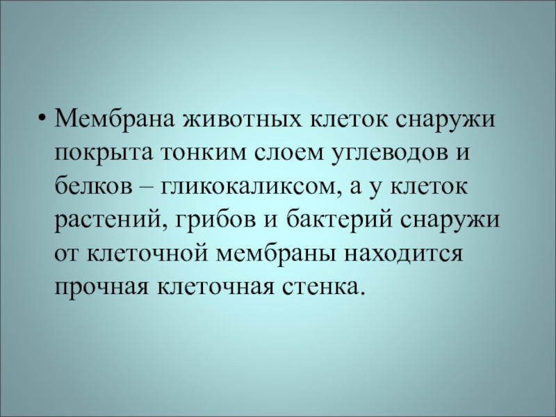 Мембрана животных клеток снаружи покрыта тонким слоем углеводов и белков –