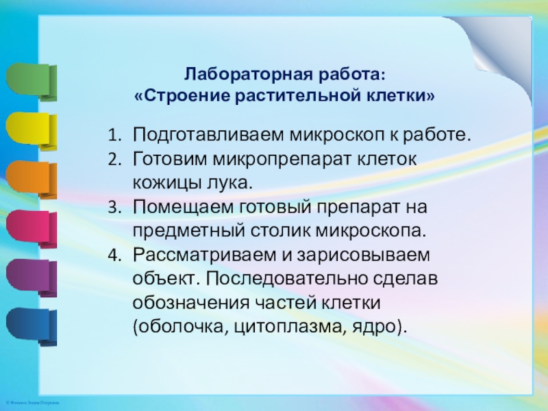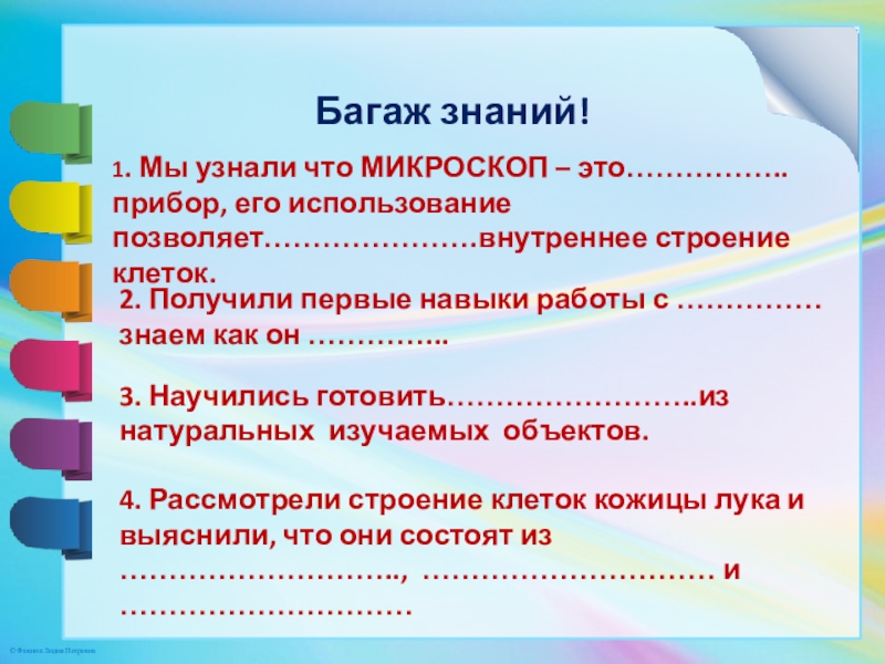 4. Рассмотрели строение клеток кожицы лука и выяснили, что они состоят из ……………………….., ………………………… и …………………………